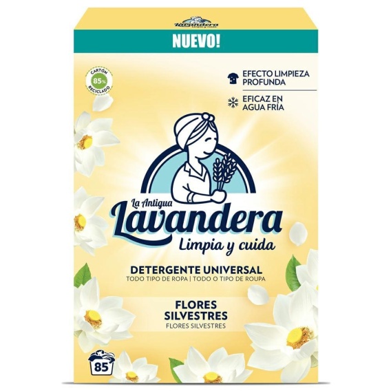 Lavandera Flores Silvestres to uniwersalny hiszpański proszek do prania o świeżym zapachu białych, dzikich kwiatów. Skutecznie usuwa zabrudzenia, chroni kolory i nadaje tkaninom długotrwałą świeżość. Odpowiedni do białych i kolorowych materiałów. Jedno opakowanie 4,675 kg starcza na 85 prań.