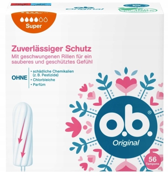 o.b. Original Super to tampony o wysokiej chłonności, przeznaczone do średniego i silnego krwawienia. Zakrzywione rowki skutecznie kierują płyn do wnętrza tamponu, zapewniając niezawodną ochronę i komfort. Opakowanie zawiera 56 sztuk, produkt pochodzi z Niemiec.