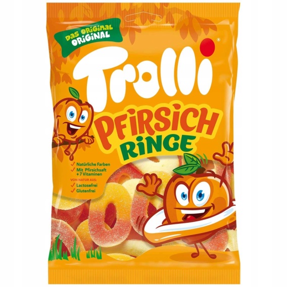 Trolli Pfirsich Ringe to jedne z najbardziej lubianych żelków o smaku brzoskwiniowym. Ich miękka sprężysta konsystencja połączona z soczystą owocową nutą sprawia że po każdy krążek sięga się z prawdziwą przyjemnością. Lekko kwaśna posypka nadaje żelkom orzeźwiający charakter a słodki aromat brzoskwini długo utrzymuje się na podniebieniu.